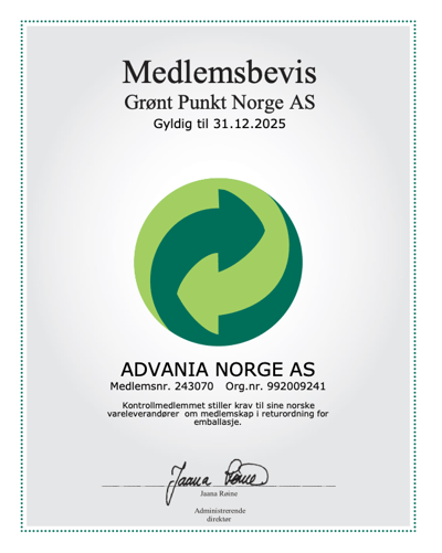 Grønt Punkt Norge er en non‑profit forening som sørger for at bedrifter tar produsentansvar for emballasje. Det gjør de ved å finansiere innsamling og materialgjenvinning, og merker dette med det kjente Grønt Punkt‑symbolet. Her kan du laste ned Advanias medlemsbevis.